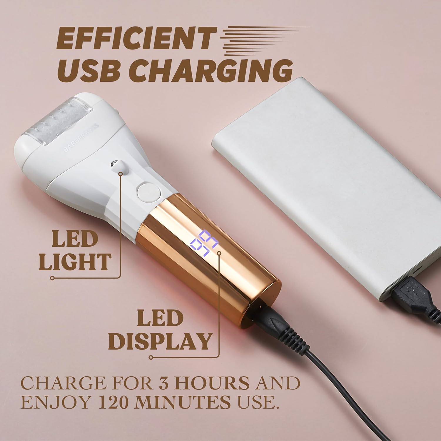 LED Display & USB Charging – Smart display shows battery level. Built-in LED light helps target tough spots. 120 mins of use after 3-hour charge via USB.