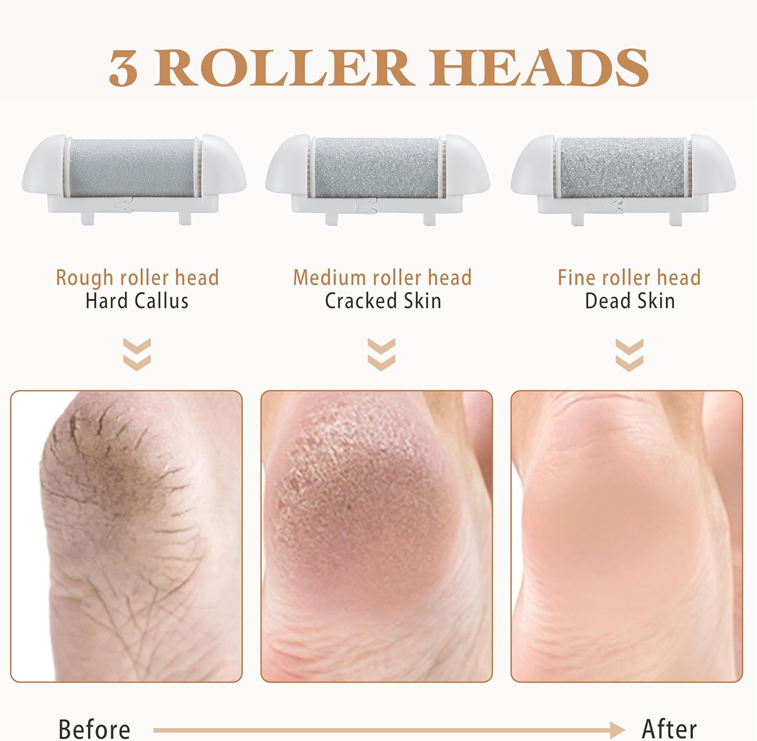 Custom Foot Care – Smoothly switch rollers for daily maintenance, calluses, or rough skin. Easy side-release button for quick changes. Not for broken skin.